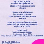 Bartın Üniversitesi Sağlık Hizmetleri Meslek Yüksekokulu Proje ve Etkinlik Komisyonu iş birliğiyle, TÜBİTAK 2209-A Üniversite Öğrencileri Araştırma Projeleri kapsamında yürütülen “Tıbbi Dokümantasyon ve Sekreterlik Programı Mezunlarının Kariyer Yolculuğu” başlıklı projenin proje yazma ve sonuç raporu sunumu gerçekleştirildi.